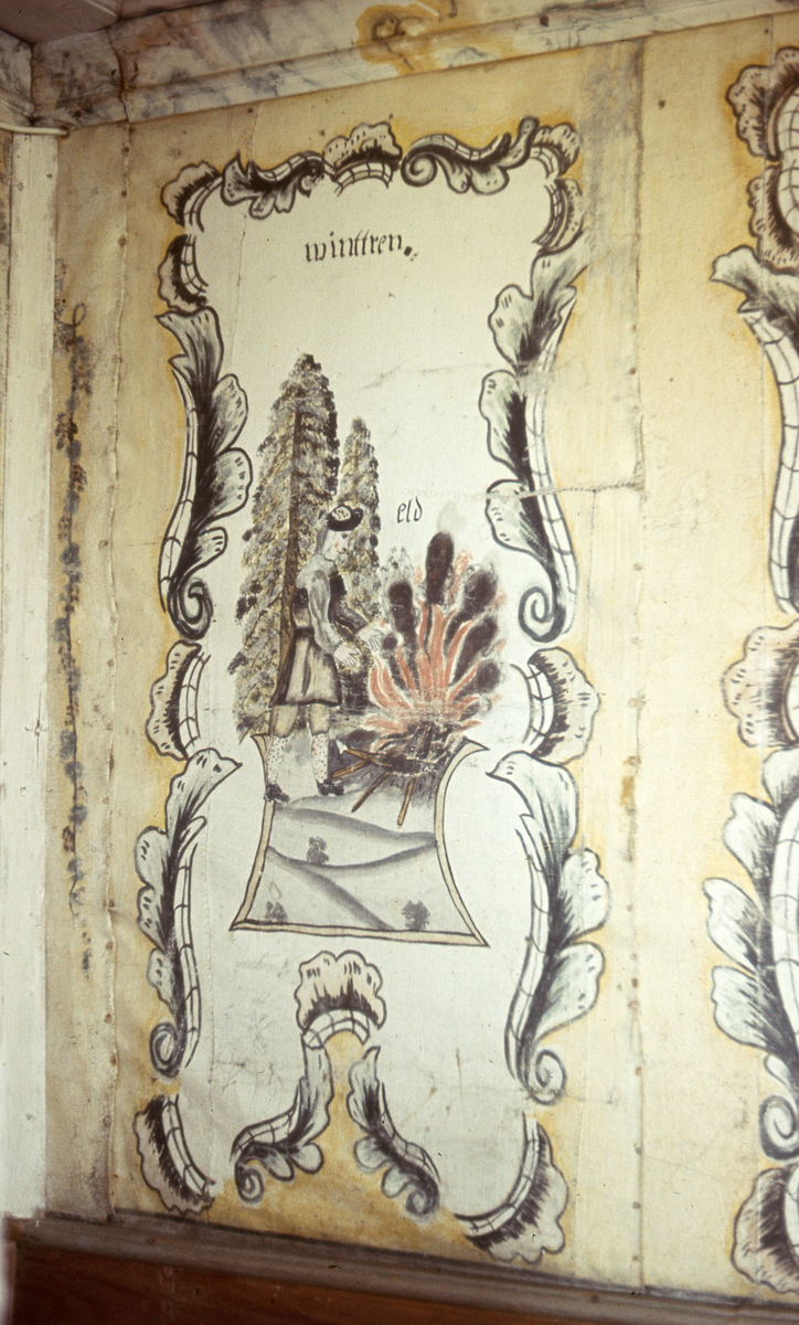 Titel: Väggmålning "Vintern". En man ute i naturen värmer sina händer mot en eld.