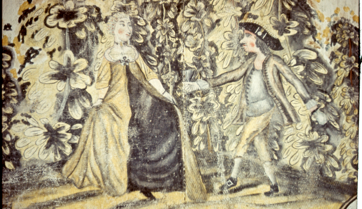 Del av väggmålning. Dansade par framför växtlighet.