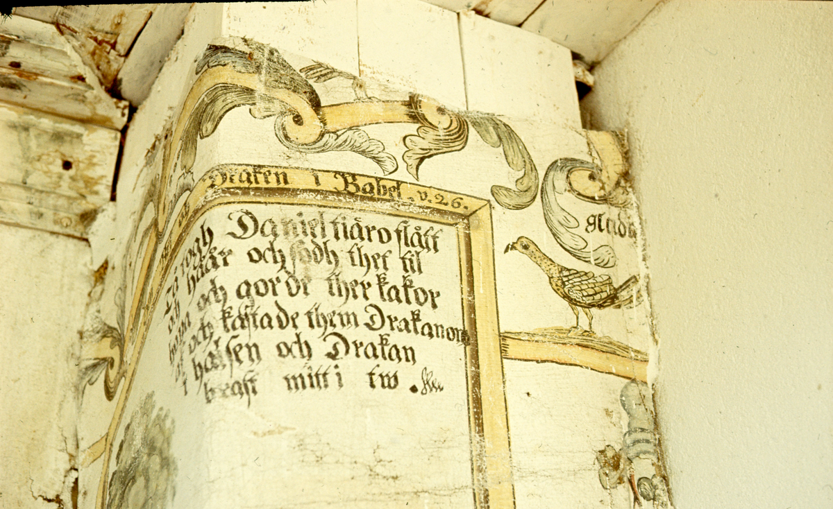 Del av väggmålning med bibliskt motiv och text. Text om Daniel som dräper draken i babylon.