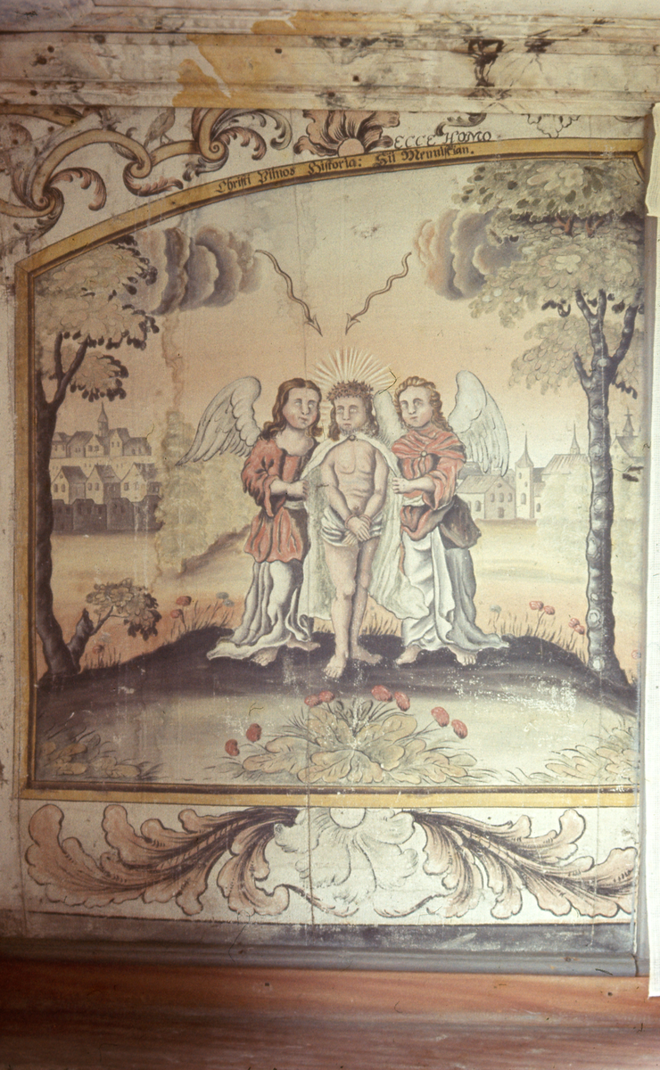 Detaljbild av väggmålning. Landskapsbild med stad i bakgrunden. I förgrunden två änglar, en på vardera sida om Jesus, med bundna händer.