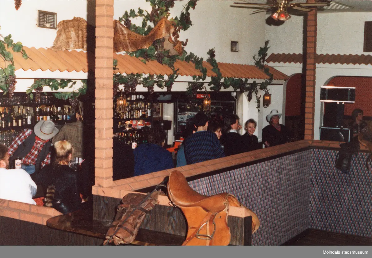 Gäster sitter i baren och vid borden på Moulin Rouge, restaurang och diskotek med adress Kvarnbygatan 1 i Mölndal, okänt årtal.