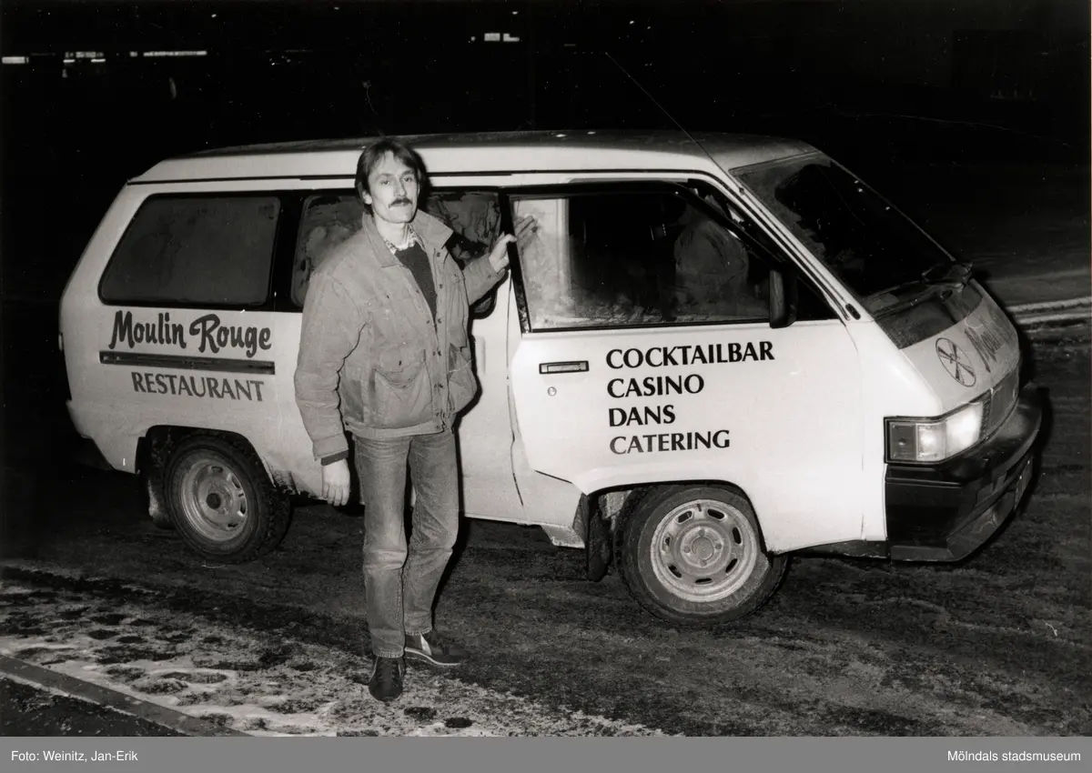 En man står vid en vit Toyotabuss tillhörande Moulin Rouge, restaurang och diskotek med adress Kvarnbygatan 1 i Mölndal, okänt årtal.