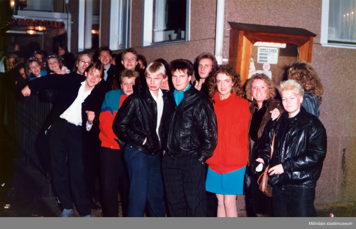 Gäster som köar utanför Moulin Rouge, restaurang och diskotek med adress Kvarnbygatan 1 i Mölndal, omkring år 1986.