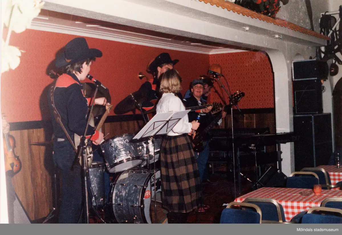 En orkester som spelar på Moulin Rouge, restaurang och diskotek med adress Kvarnbygatan 1 i Mölndal, okänt årtal.