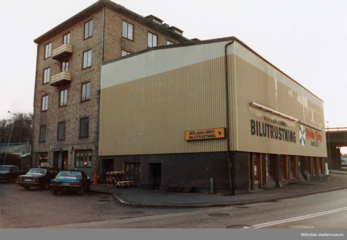 Kvarnbygatan 1 i Mölndal, omkring år 1986. I huset låg Moulin Rouge, restaurang och diskotek.