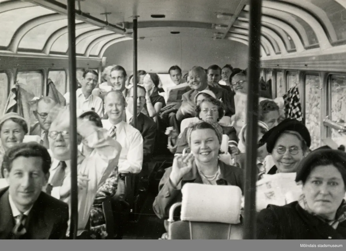 Bussresa till Tylösand för arbetskamraterna vid Bergströms Herrekipering (Norra Hamngatan i Göteborg) 1953/1954. Chef för butiken var Bror "Petter" Pettersson, far till givaren.