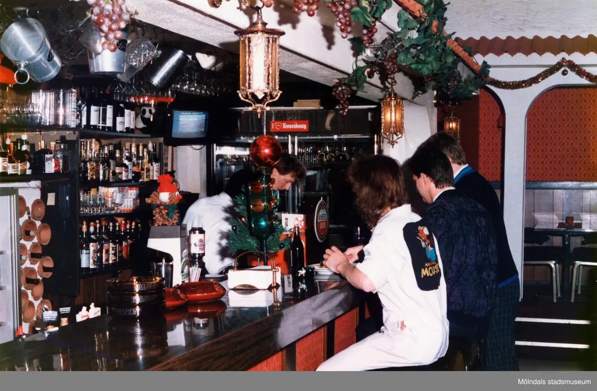 Gäster sitter i baren på Moulin Rouge, restaurang och diskotek med adress Kvarnbygatan 1 i Mölndal, omkring år 1986.