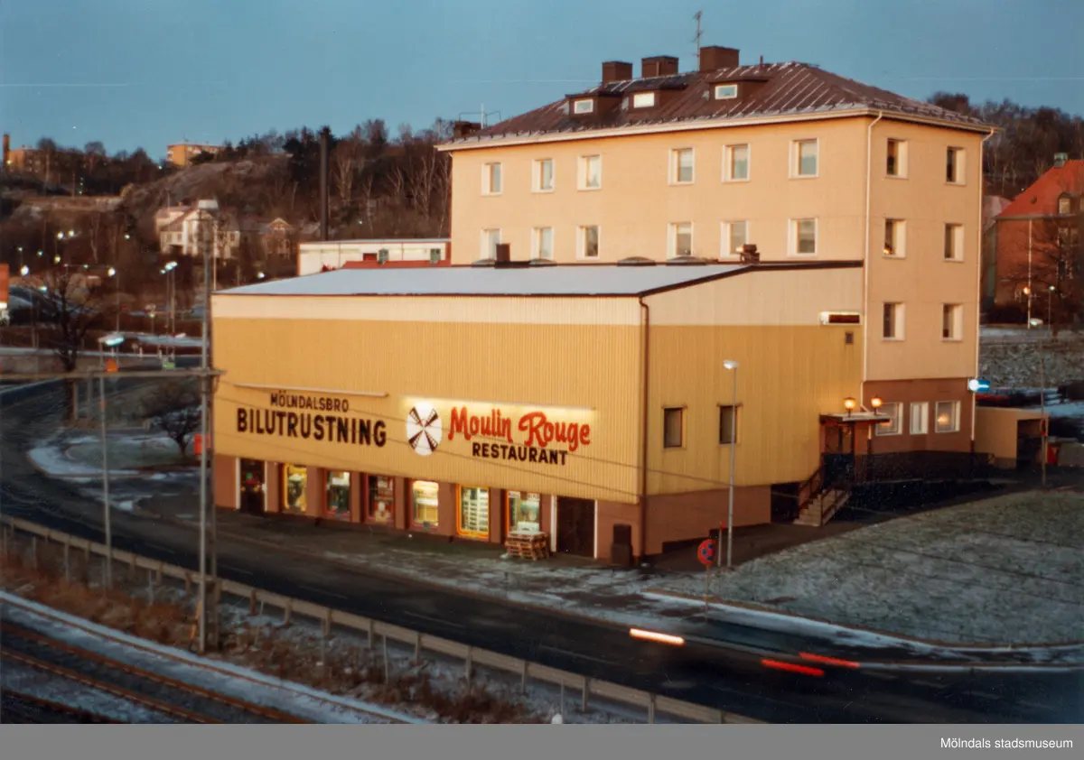Vy från Mölndals Bro mot Moulin Rouge, restaurang och diskotek med adress Kvarnbygatan 1 i Mölndal, omkring år 1986.