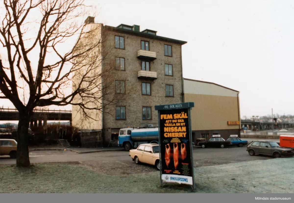 Kvarnbygatan 1 i Mölndal, omkring år 1986. I huset låg Moulin Rouge, restaurang och diskotek. I bakgrunden Mölndals Bro.