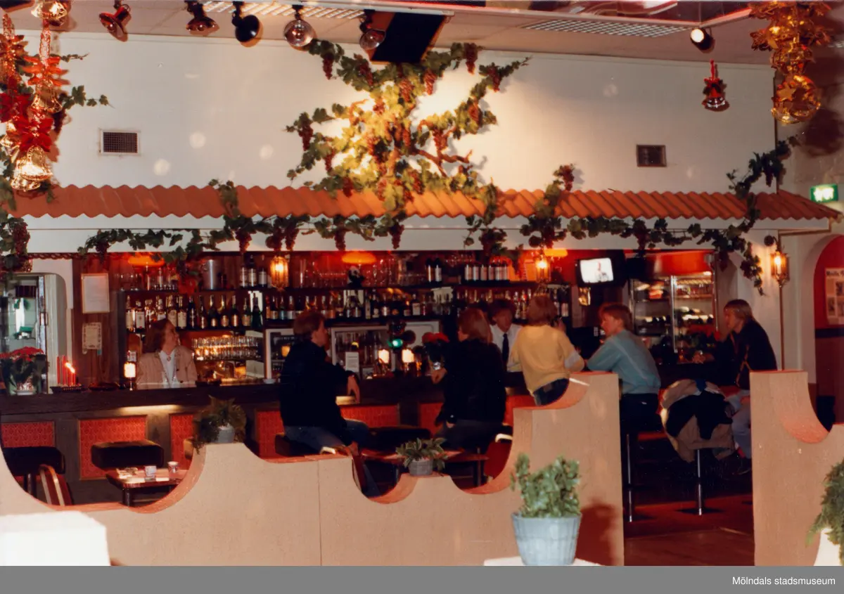Gäster sitter i baren på Moulin Rouge, restaurang och diskotek med adress Kvarnbygatan 1 i Mölndal, år 1988.
