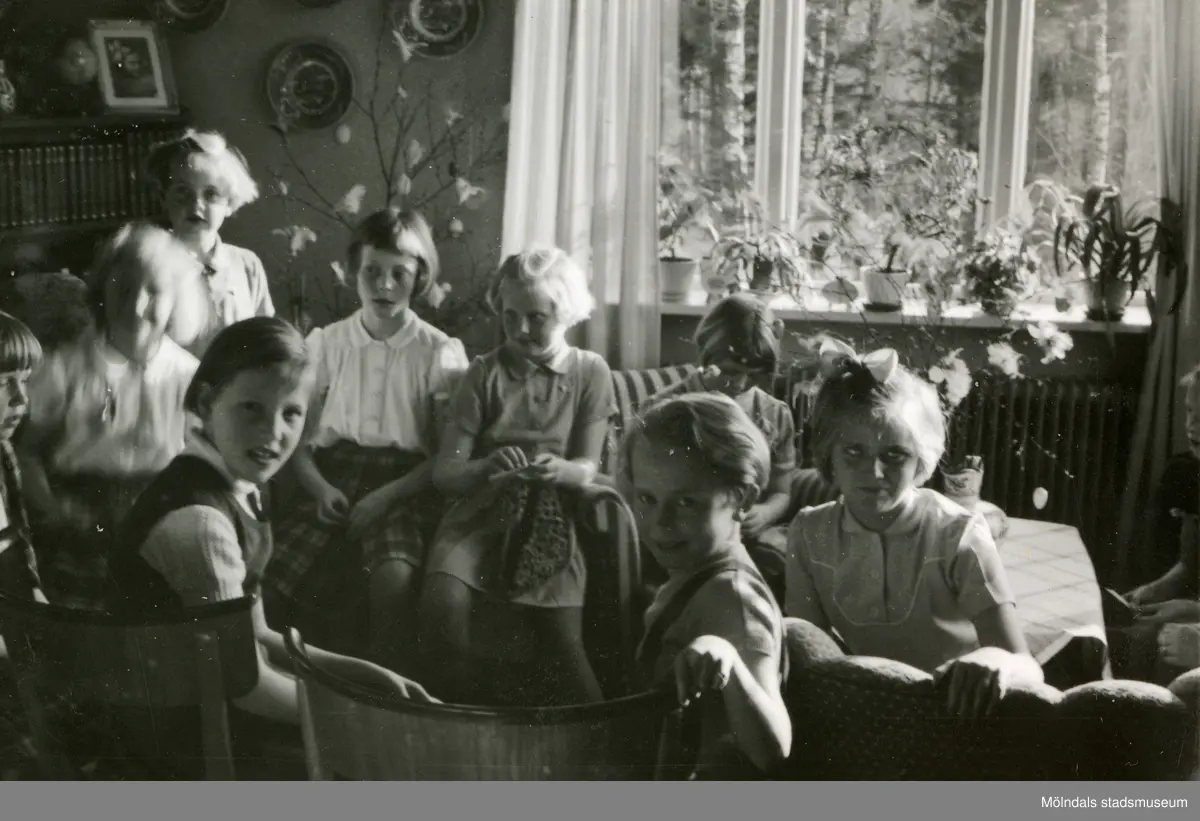 Barn sitter samlade runt ett bord då det är födelsedagskalas för Eva Pettersson (gift Kempe) som fyller 10 år, Gamlehagsvägen i Torrekulla, påskdagen 16/4 1954.