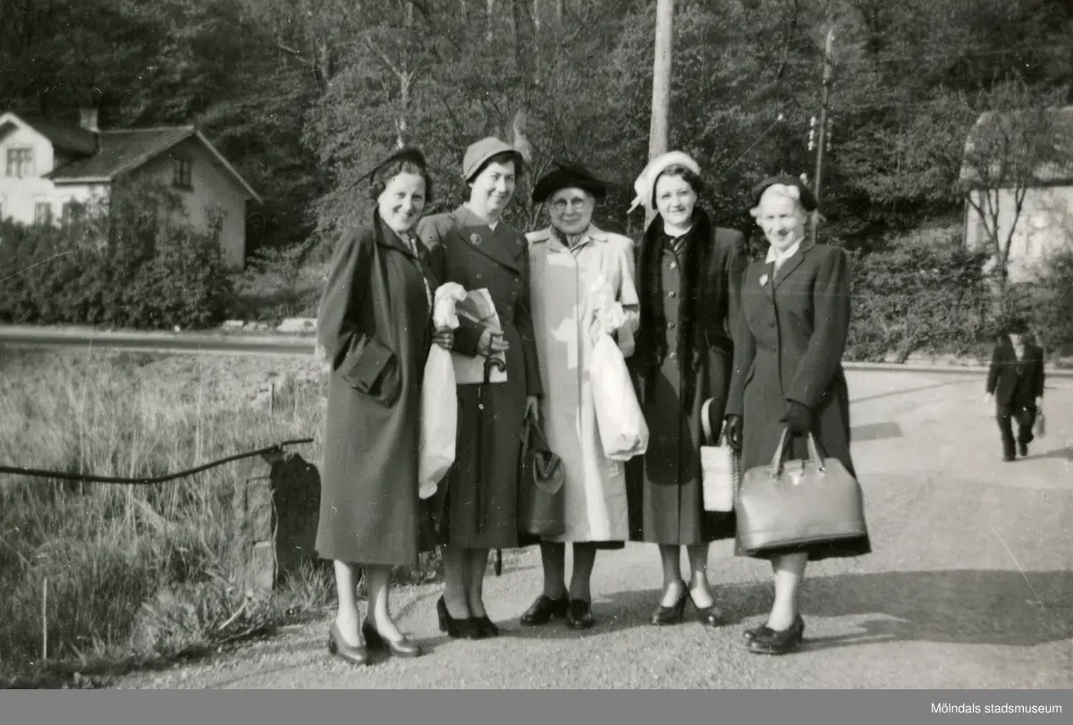 "Sömmerskorna" (arbetskamraterna) är på väg från bussen till "Petters" 40-årskalas på Gamlehagsvägen 17 i Torrekulla den 18 maj 1953. Bror "Petter" Pettersson firade sin 40-årsdag tillsammans med familjen och arbetskamraterna i hemmet. "Petter" arbetade som skräddare på Bergströms herrekipering i Göteborg.