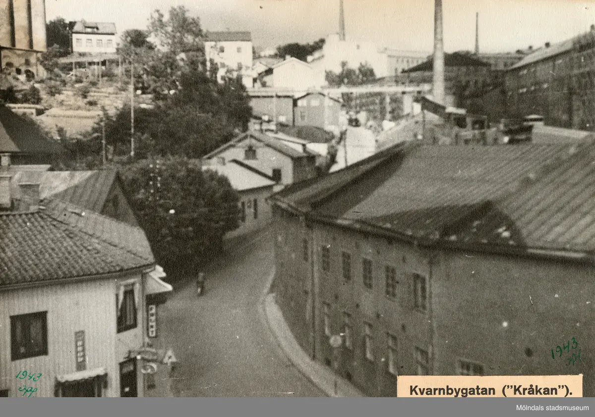 Industribebyggelse längs Kvarnbygatan, "Kråkan", i Mölndals Kvarnby, år 1943. Vy från Gamla Torget.