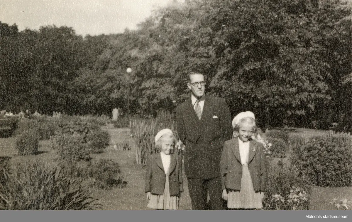 Systrarna Karin (gift Hansson) och Eva (gift Kempe) är med pappa Bror "Petter" Pettersson i Trädgårdsföreningen midsommardagen 1952.