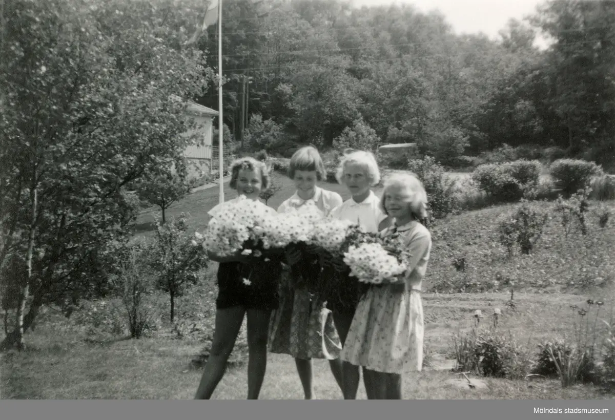 Fyra flickor står uppställda med nyplockade midsommarblommor i famnen, Torrekulla 1957. Från vänster: Monika Axelsson, Eva Pettersson (gift Kempe), Lena Englund och Karin Pettersson (gift Hansson).