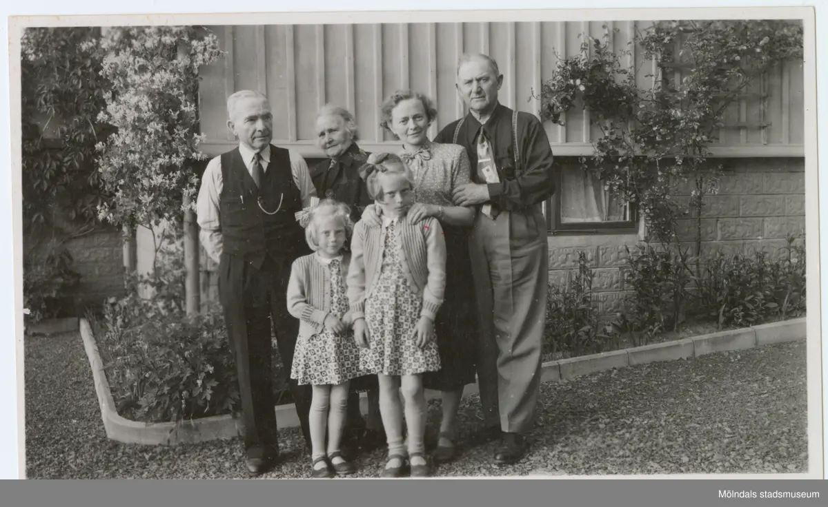 Släktingar på besök hos familjen Pettersson, Gamlehagsvägen 17, 1952. Bakre rad från vänster: morfar Carl Krantz, mormor Nora Krantz, Rosa Pettersson (född Krantz) och Frank Johansson (Noras svåger). Främst ses systrarna Karin och Eva Pettersson. Familjen Petterssons villa ses i bakgrunden.