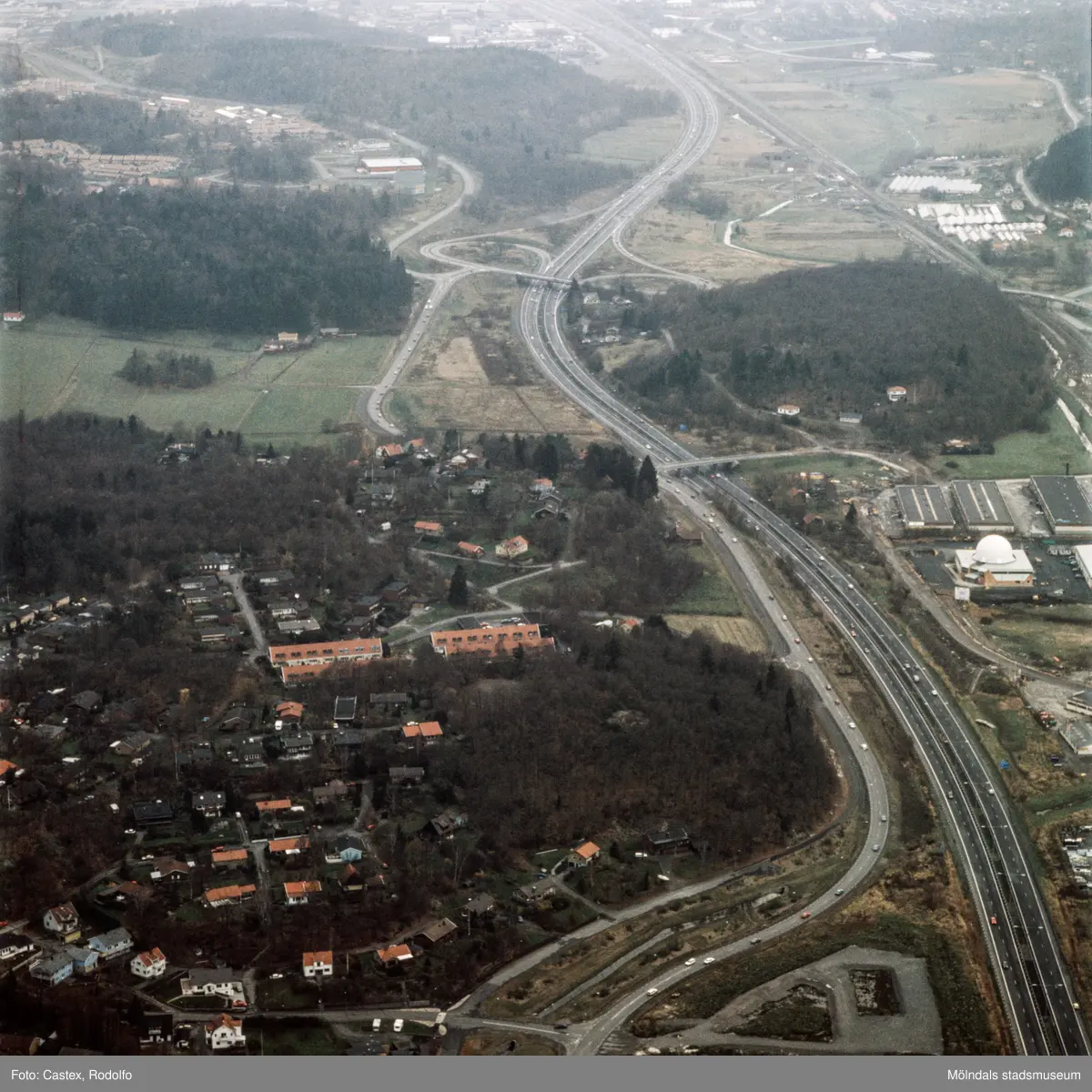 Flygfoto som visar Kungsbackaledens sträckning från Torrekulla i Kållered norrut, mot Mölndal. Okänt årtal.