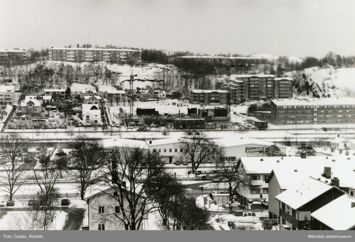 Mölndal en vinterdag 1993-1994. Vy från Bosgården mot Trädgården samt, uppe på höjden, Enerbacken.