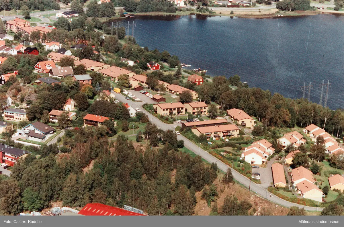 Flygfoto över Stensjöhöjd i Mölndal, okänt årtal. Bostadsbebyggelse intill Stensjön. Närmast ses hus vid Höjdgatan.