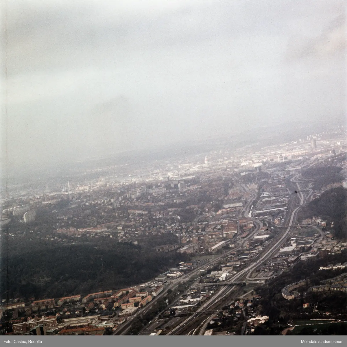 Flygfoto över del av Mölndal, okänt årtal. Närmast Bosgården, Trädgården och Enerbacken. Vy mot Lackarebäck och Krokslätt. I bakgrunden Göteborg.