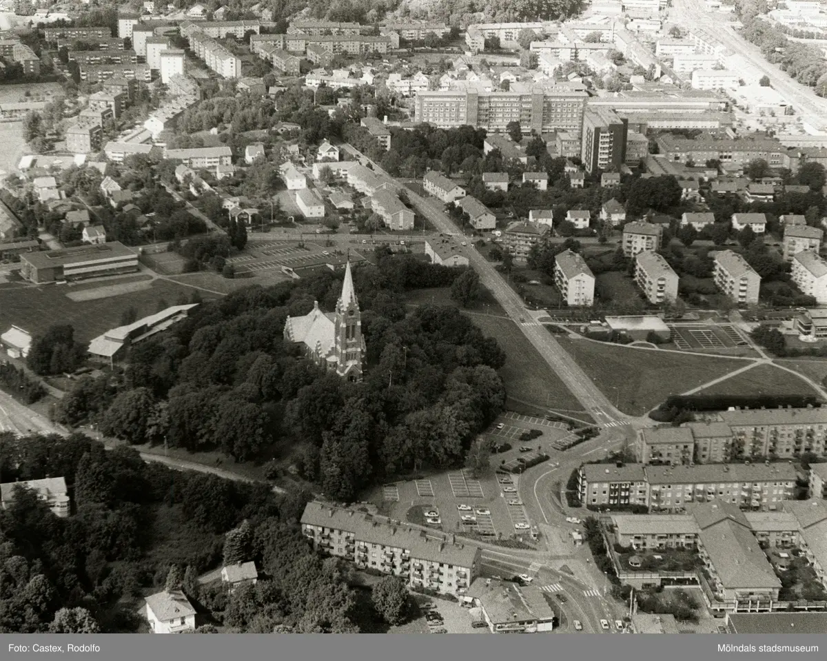 Flygfoto över bebyggelse i centrala Mölndal, okänt årtal. Mölndalsbro mot Bosgården. I mitten Fässbergs kyrka.