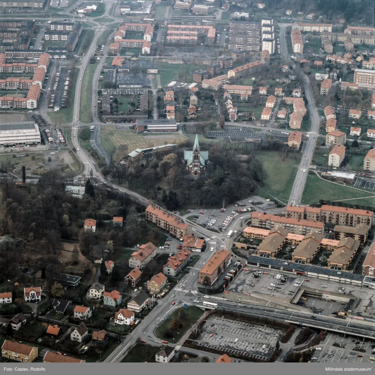 Flygfoto över de centrala delarna av Mölndal, okänt årtal. Mölndalsbro mot Bosgården. I bildens mitt Fässbergs kyrka.