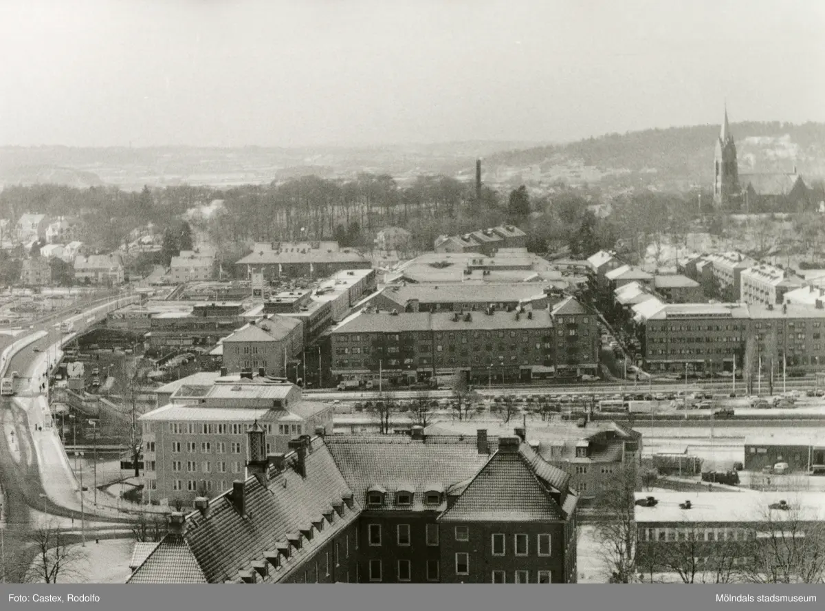 Mölndal en vinterdag 1993-1994. Vy från Trädgården, över Kvarnbyskolan, mot bebyggelse i Mölndals centrum. Till vänster Mölndals Bro, till höger Fässbergs kyrka.