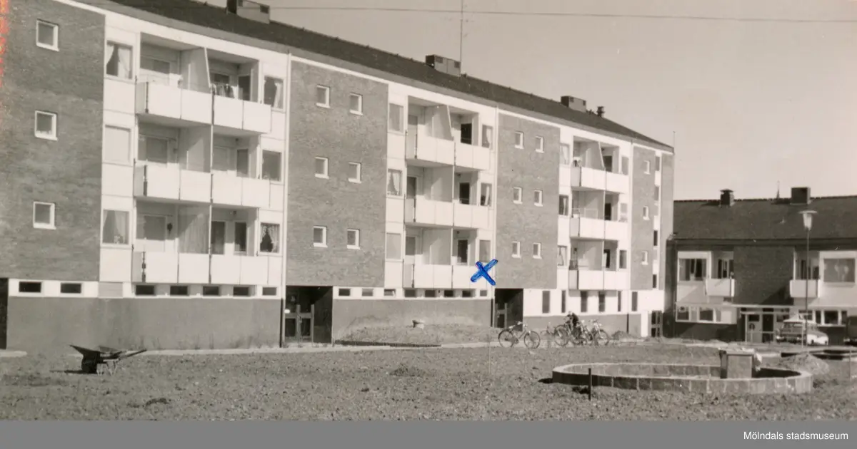 Det nya bostadsområdet vid Jungfruplatsen år 1960, där familjen Tobiasson bodde under 1 år. Lägenheten på Bågskyttegatan 3g i Mölndal är markerat på bilden. Lekplatsen är ännu inte klar.