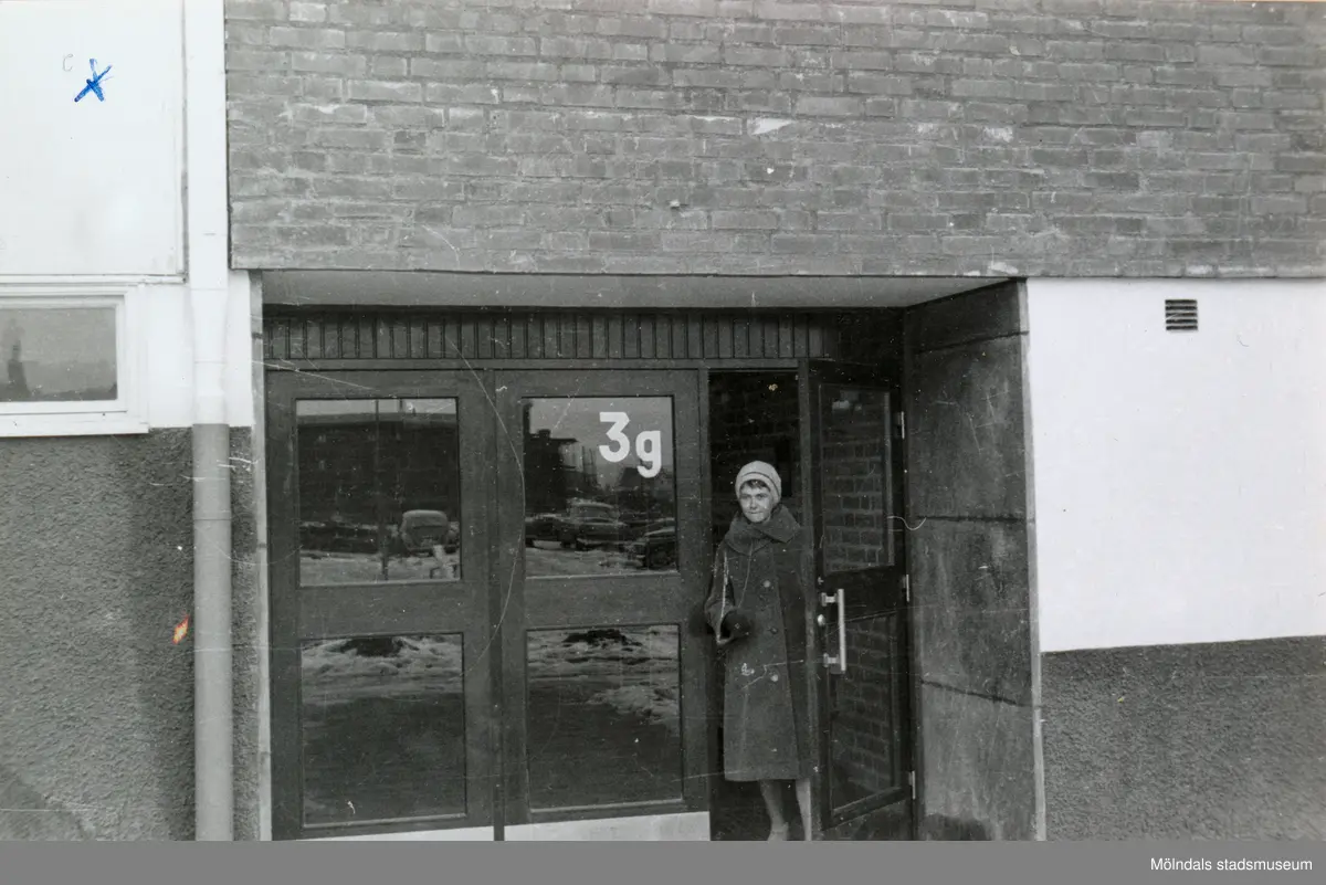 Ninnie Tobiasson (född Johansson) står i porten till Bågskyttegatan 3g i Mölndal år 1960. Hon är här gravid med dottern Ilse.