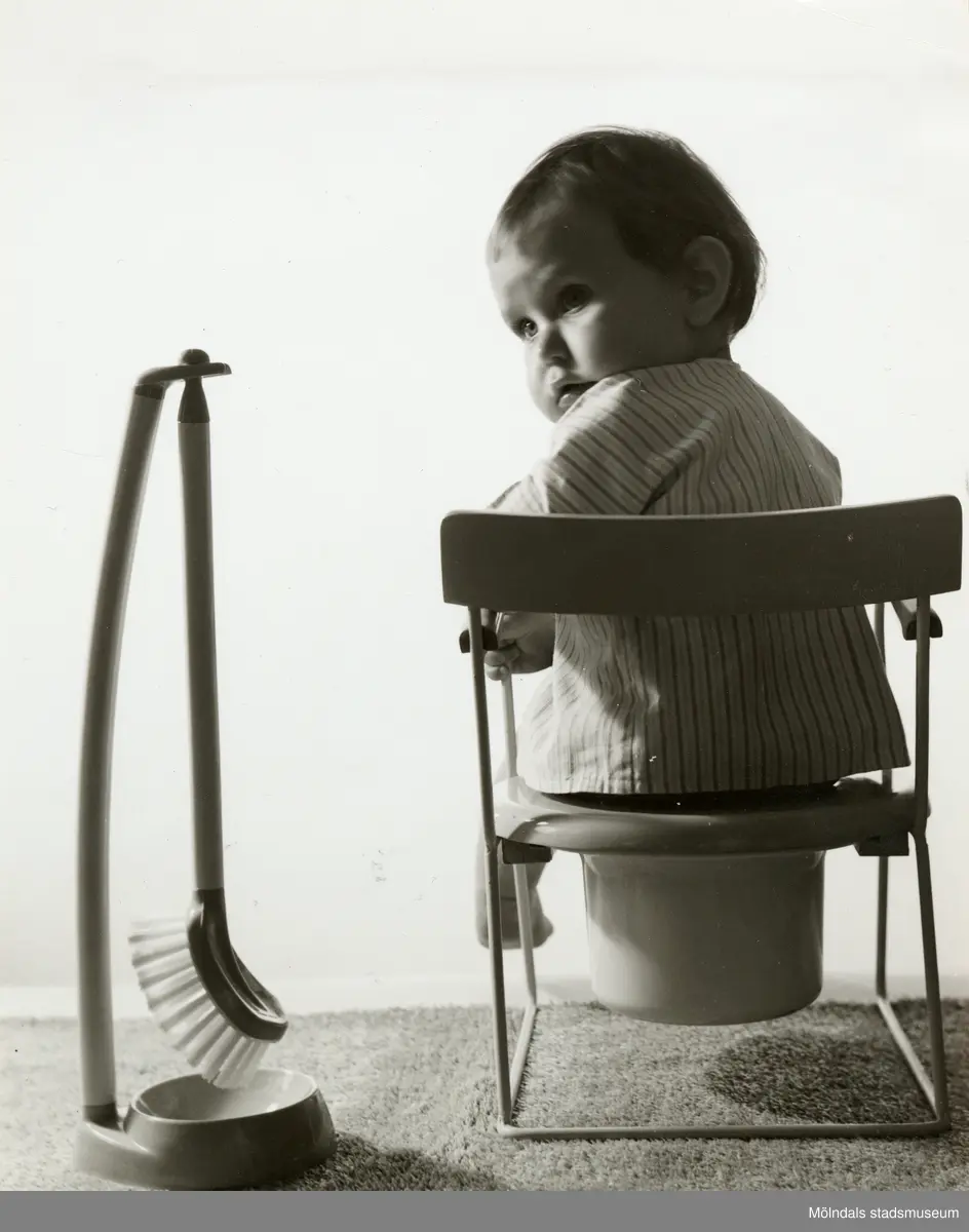13 månader gamla Ilse Tobiasson (gift Glimberg) sitter på en potta, Bågskyttegatan 3g april 1961. Hon är fotograferad av en hobbyfotograf (namn saknas) som bodde i samma trappuppgång som familjen Tobiasson.