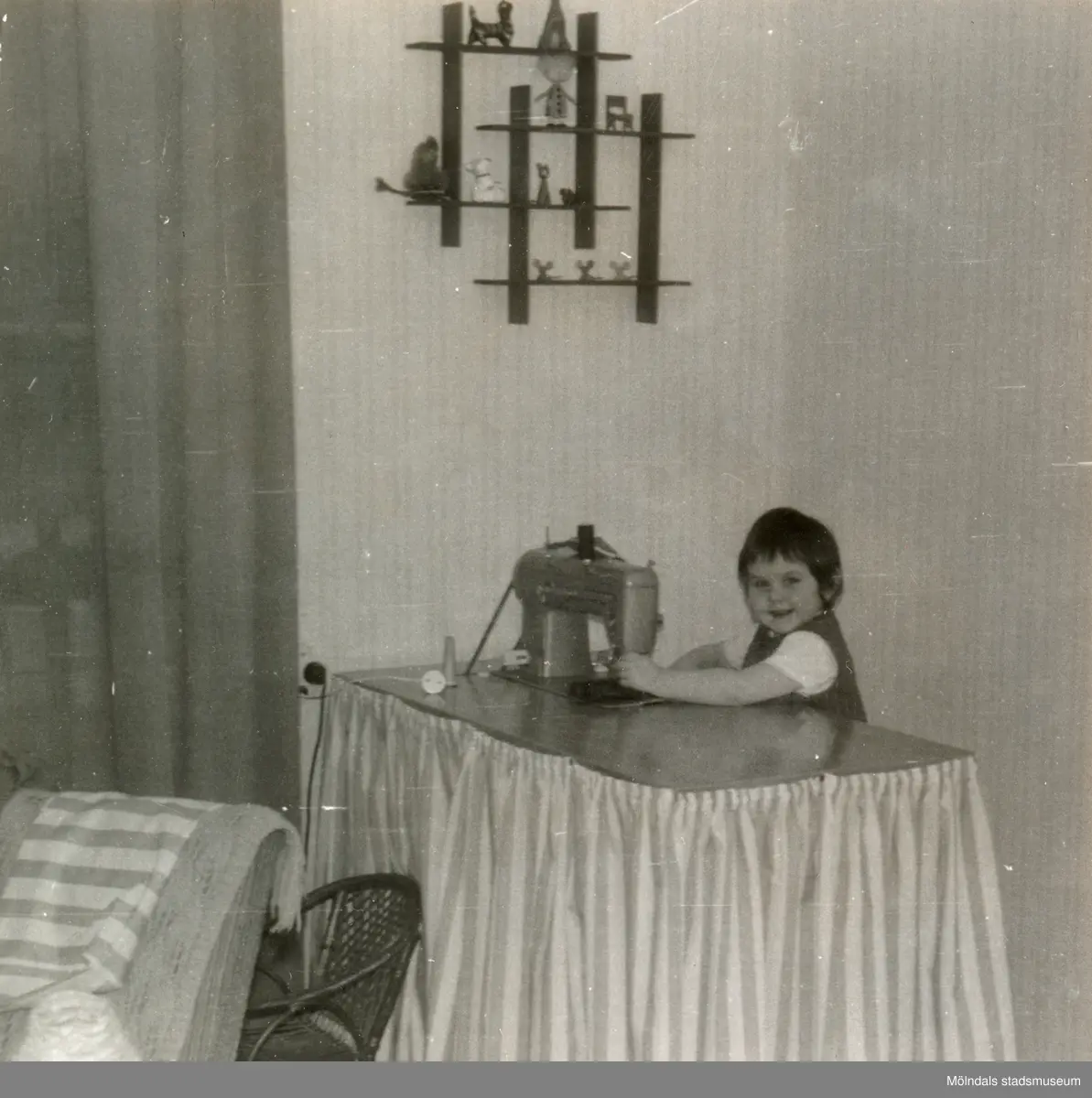 3-åriga Ilse Tobiasson (född 1960, gift Glimberg) lånar moderns symaskin (Pfaff) "Ska bara sy en liten klänning", Krokslättsgatan 3 år 1963. Syintresset avtog tyvärr med tiden.