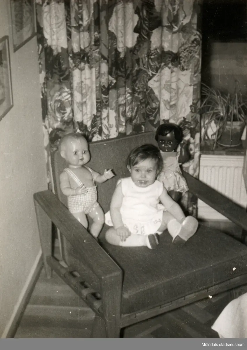Ilse Tobiasson (gift Glimberg) uppvaktas på 1-årsdagen 29 mars 1961, Bågskyttegatan 3g i Mölndal. Hon sitter i en fåtölj omgiven av två dockor.