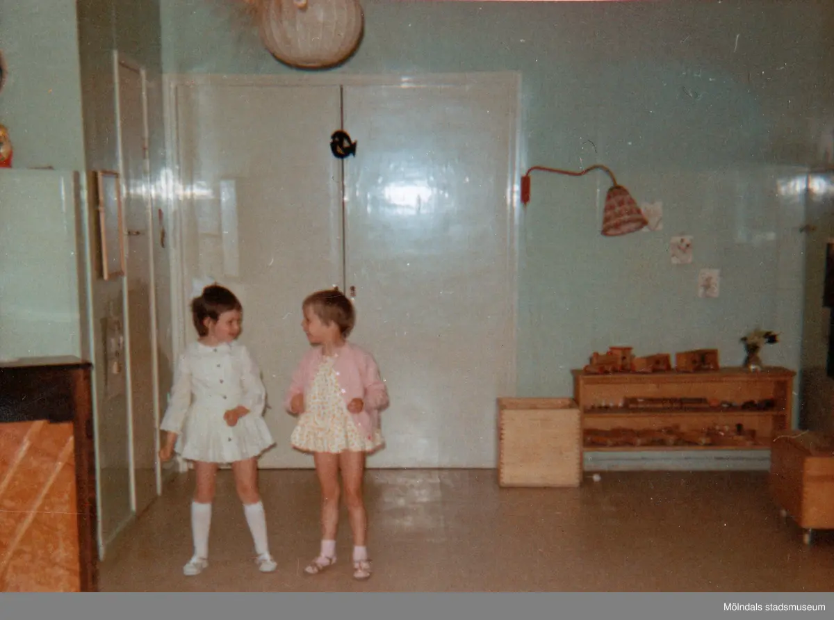 Lekskolekamraterna Ilse Jansson (gift Glimberg) och okänd flicka sjunger "Jag hamrar, jag spikar, jag bygger en bil" vid våravslutningen i Krokslätts lekskola på Dahlhemsgatan 1967.