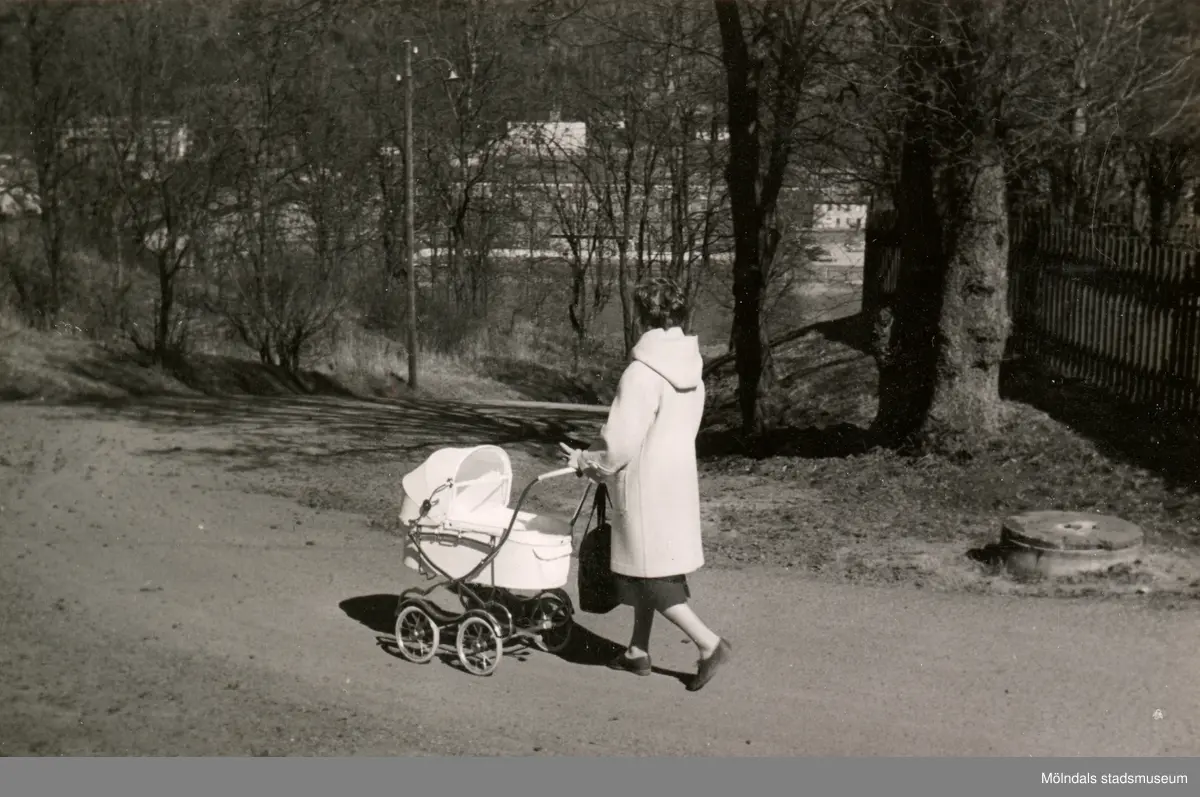 Ninnie Tobiasson (född Johansson 1937) promenerar nedför Krokslättsskolans skolbacke med dottern Ilse (född 1960, gift Glimberg) liggandes i barnvagnen. De har varit på besök hos mormor och morfar som bodde i en lägenhet snett mittemot skolans framsida (byggnaden är riven). Familjen har sett ett TV-program då prinsessan Margret (1930 - 2002), grevinna av Snowdon, år 1960 gifte sig med Anthony Armstrong-Jones (1930 - 2017). I fonden mellan träden skymtar Krokslätt och dess fabriker till höger.
