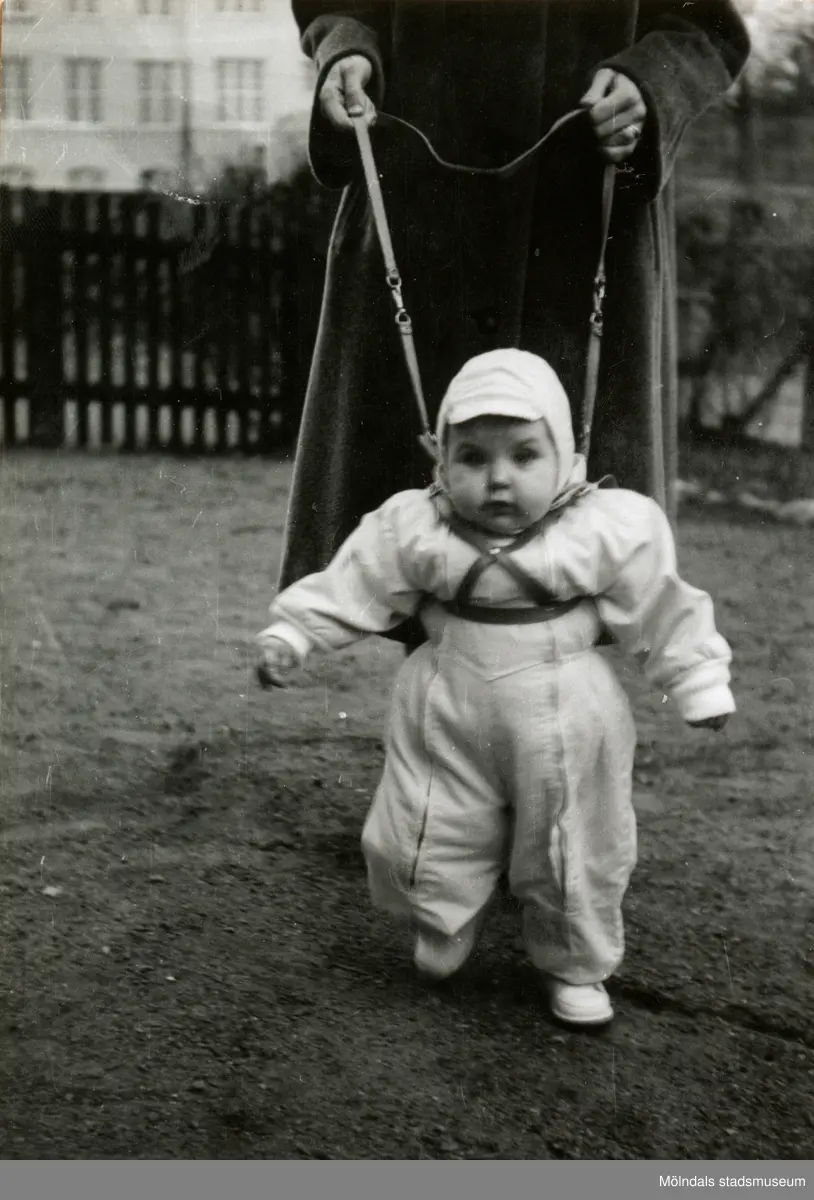 Ninnie Tobiasson (född Johansson, 1937) testar att lära dottern Ilse (född 1960, gift Glimberg) att gå med hjälp av en sele, Krokslätt 1960. Hemma hos mormor och morfar som bodde vid nedförsbacken mitt emot Krokslättsskolan. Skolan ses i bakgrunden.