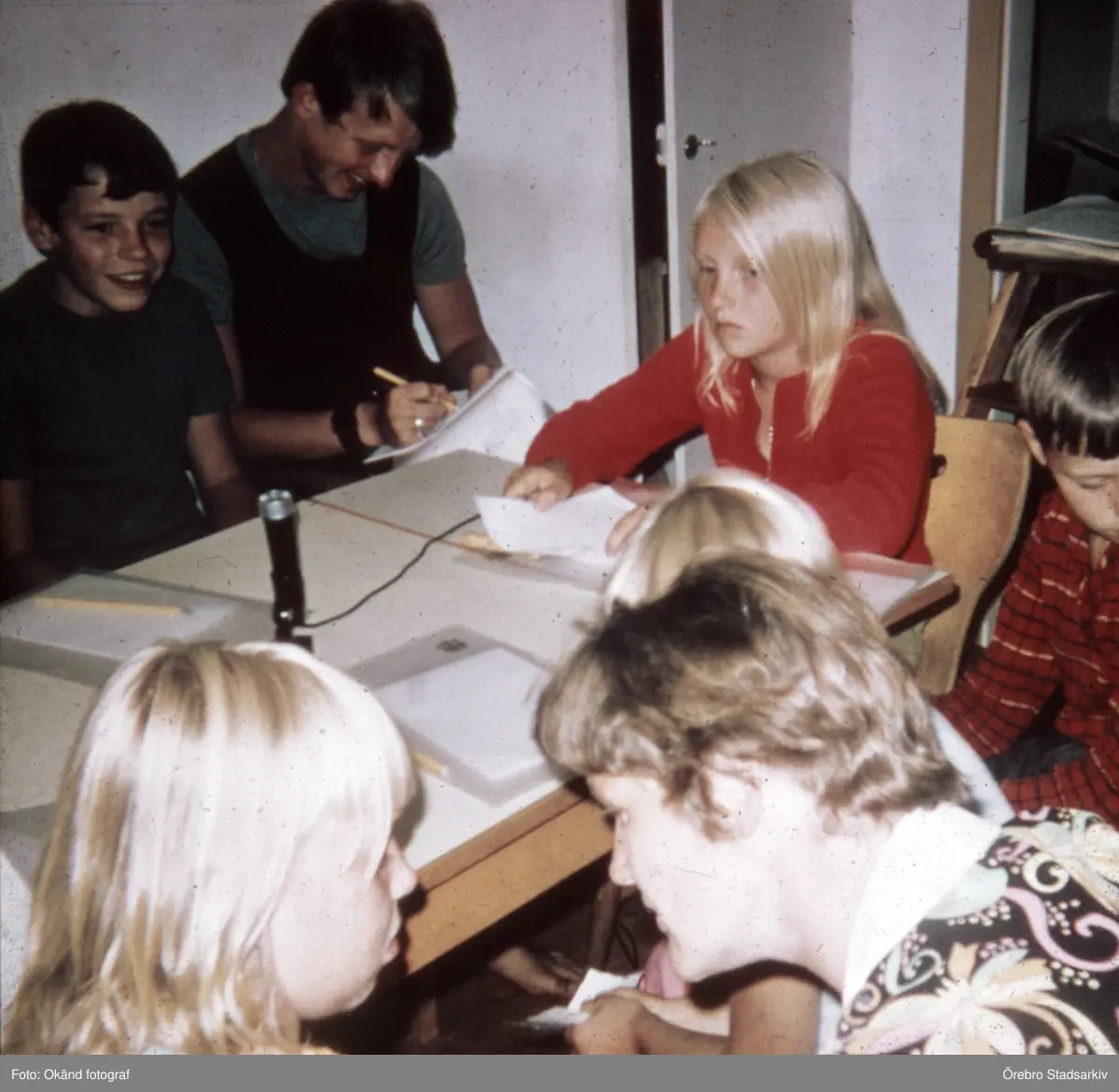 Ungdomar intervjuar varandra på föreningsgård, 1970-tal