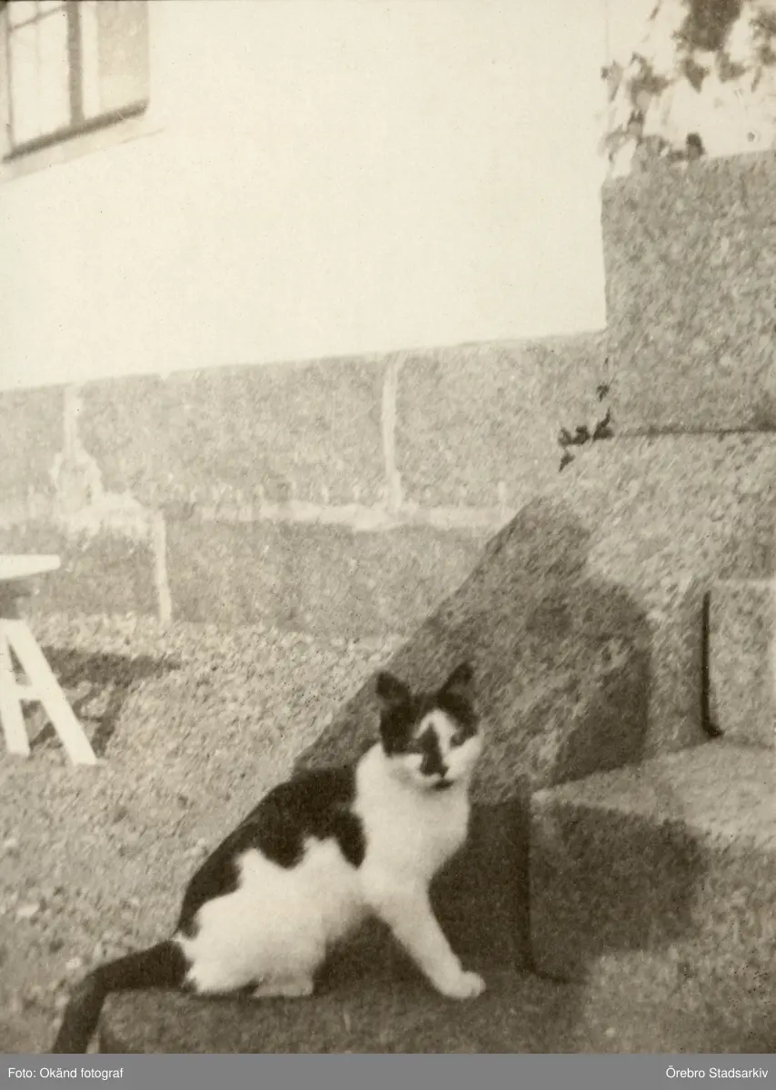 Katten Madame Cahier på trappan till Pettersbergs gård, 1919