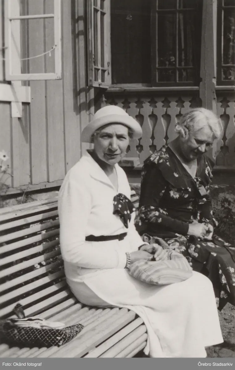 Två kvinnor på en soffa utanför Pettersbergs gård, 1930-tal
