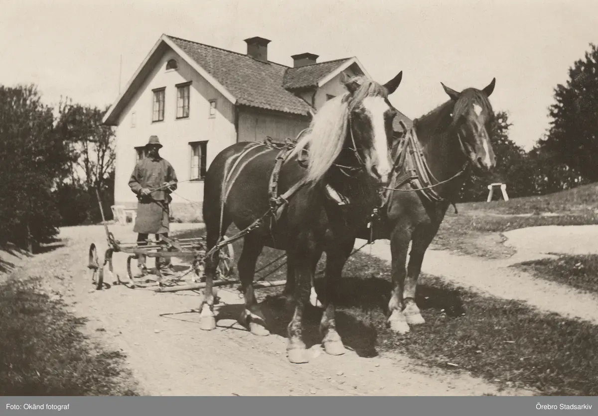 Arbetshästar framför harven på Pettersbergs gård, 1920-tal