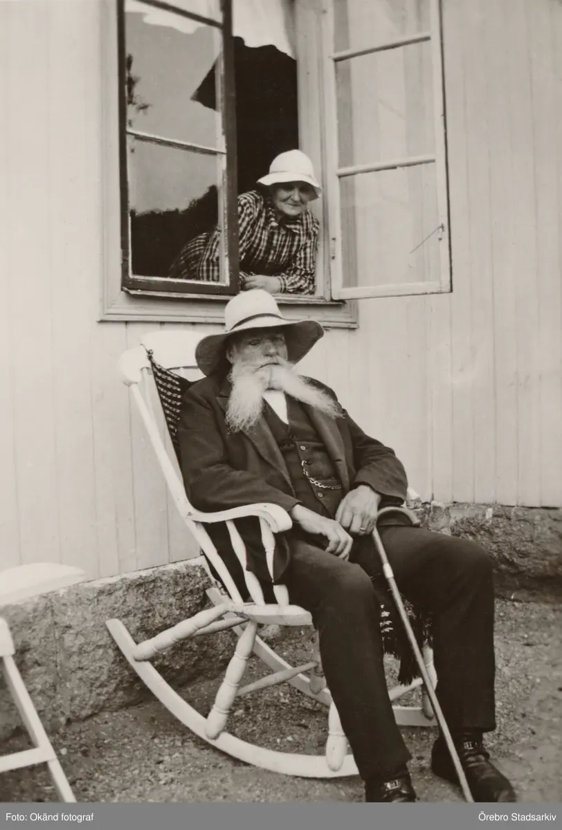 Anna Larsson tittar ut genom fönstret på sin make Axel Larsson i gungstolen på Pettersbergs gård, 1938