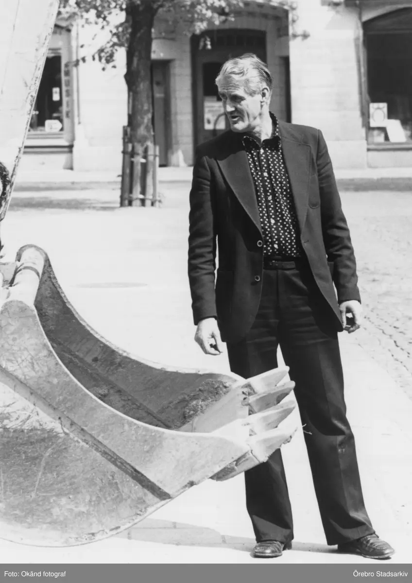 Verkmästaren Bengt Eriksson från Elverket står vid grävskopa, 1980-tal