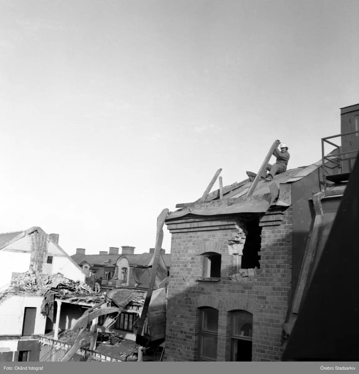 Man bryter bort taket på Fredsgatan 4 under rivning, 1970-tal