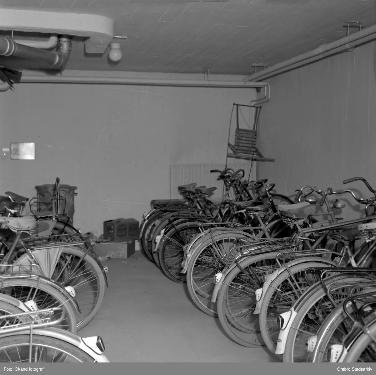 Sparkstöttning lutat mot vägg i cykelförråd i Markbacken, 1960-tal