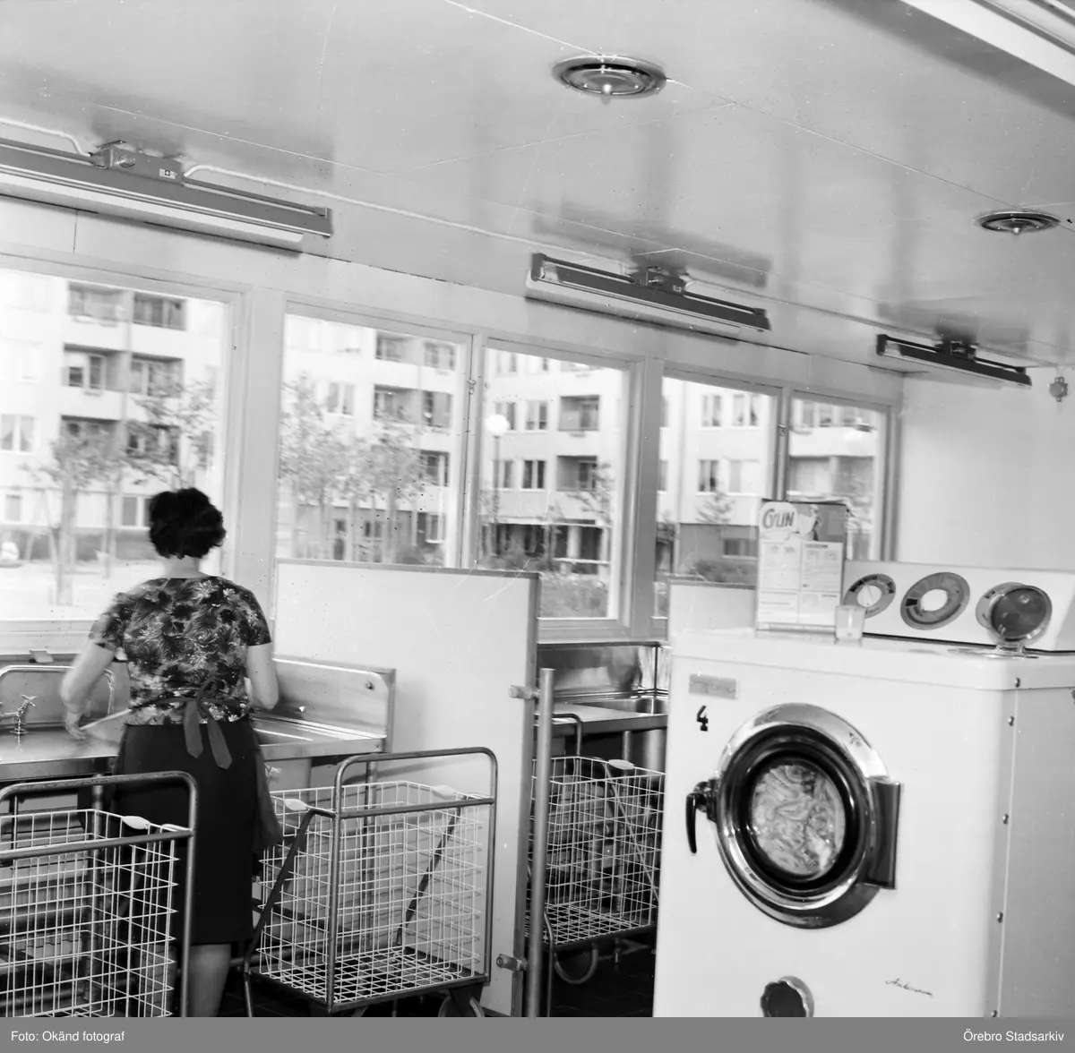 Kvinna använder tvätthon i tvättstuga i Markbacken, 1960-tal