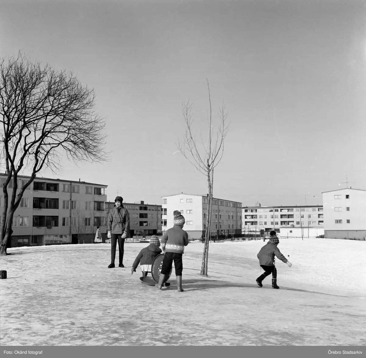 Titel: Pulkaåkning i Markbacken, 1960-tal