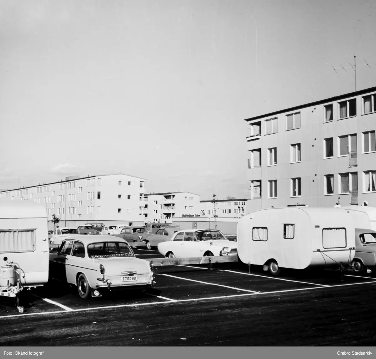 Bilar och husvagnar på parkering i Markbacken, 1960-tal