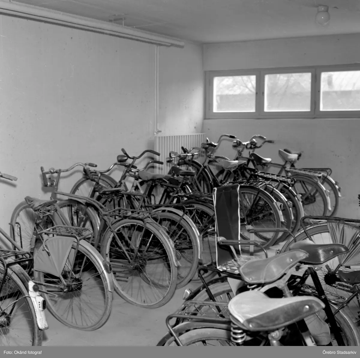 Cyklar på rad i cykelförråd i Markbacken, 1960-tal
