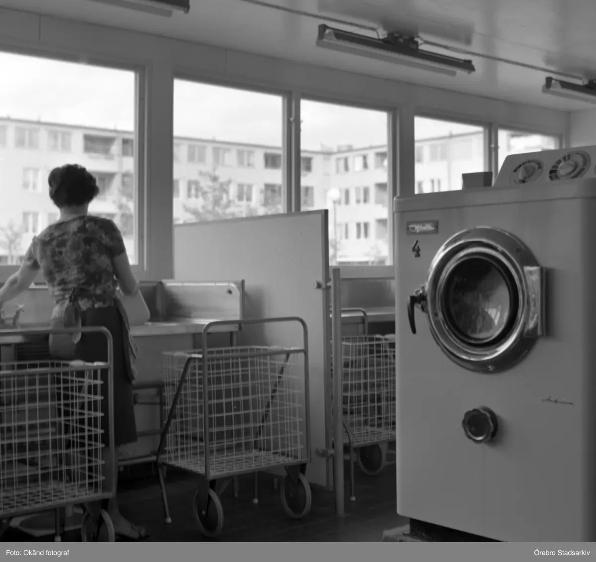Kvinna tvättar för hand i tvättstuga i Markbacken, 1960-tal
