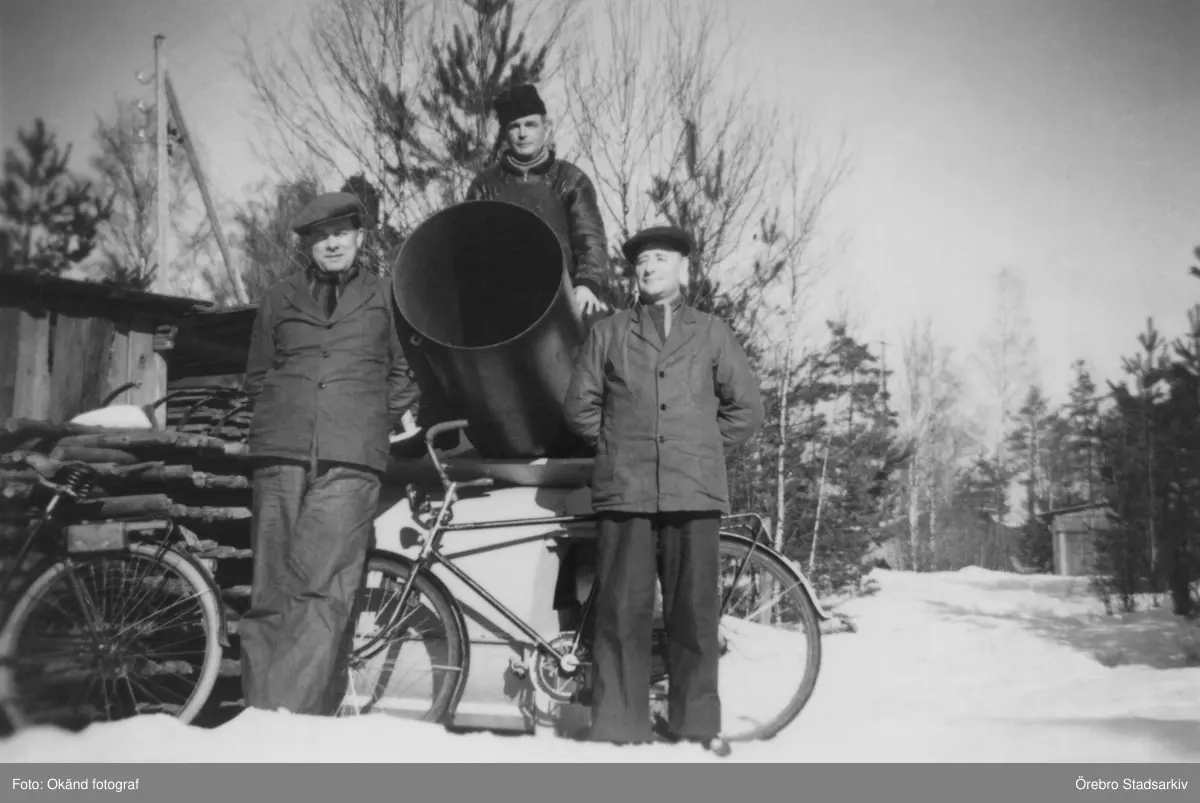 Tre arbetare med rör utanför arbetsbod, 1960-tal