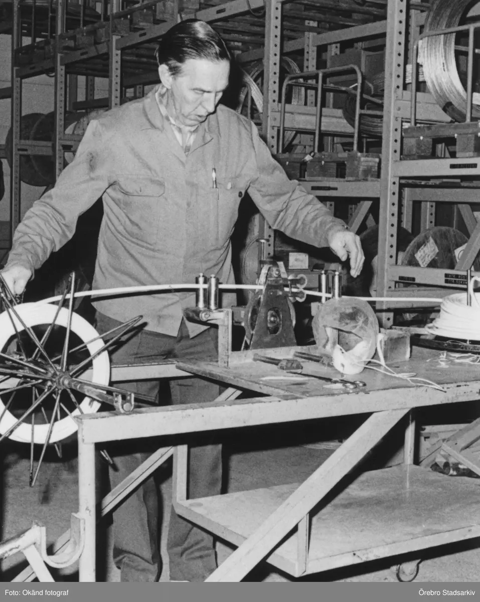 Förrådsarbetare monterar något på elverket, 1960-tal